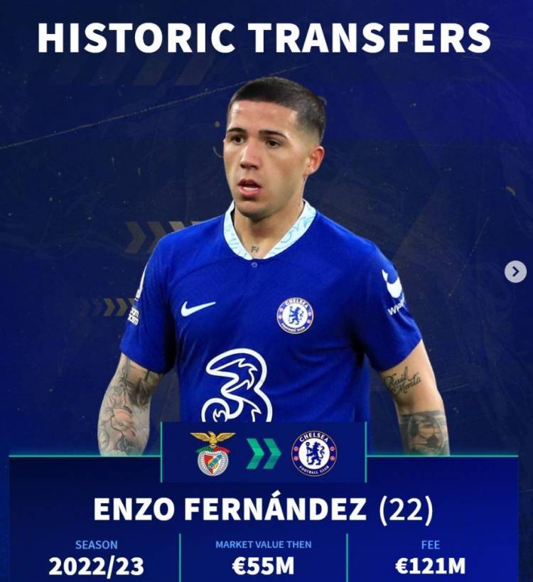 恩佐(22-23赛季,22岁),本菲卡→切尔西,身价5500万,转会费1.21亿欧元