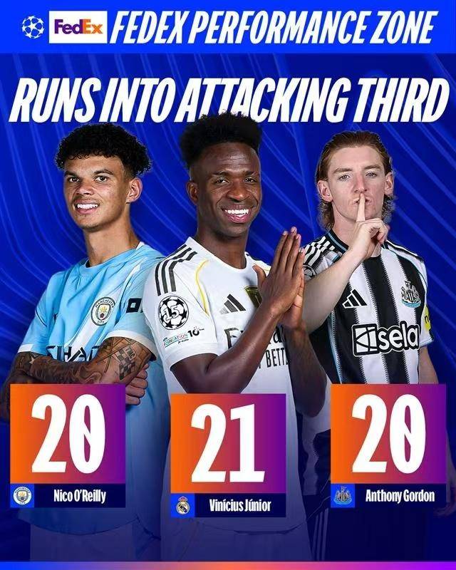 皇家马德里的维尼修斯则在带球进入进攻三区榜单上占据首位,他以21次的成功带球突破,力压曼城的奥赖利和纽卡斯尔的戈登(均为20次)。维尼修斯凭借其风驰电掣的速度和极具威胁的边路冲击力,成为了皇马进攻端的一把利刃,频频撕开对手的防线,他和姆巴佩组成的边路进攻组合,已经成为皇马在欧冠赛场上的制胜法宝。